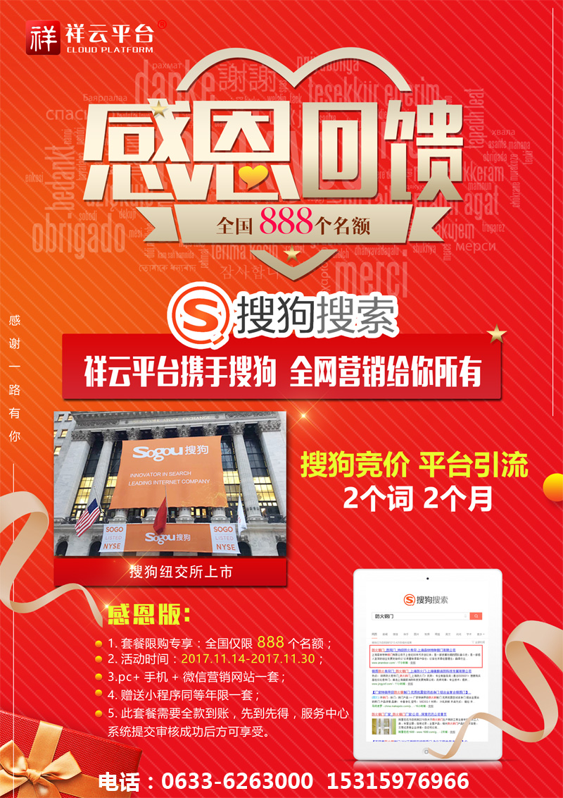 2017年11月9日,搜狗在紐交所上市,成為國(guó)內(nèi)第二大搜索引擎,祥云聯(lián)合搜狗,推出2017感恩鉅惠活動(dòng):凡簽約祥云營(yíng)銷型網(wǎng)站,即送搜狗競(jìng)價(jià)關(guān)鍵詞,兩個(gè)詞,兩個(gè)月!名額有限,先到先得!電話:0633-6263000 15315976966
